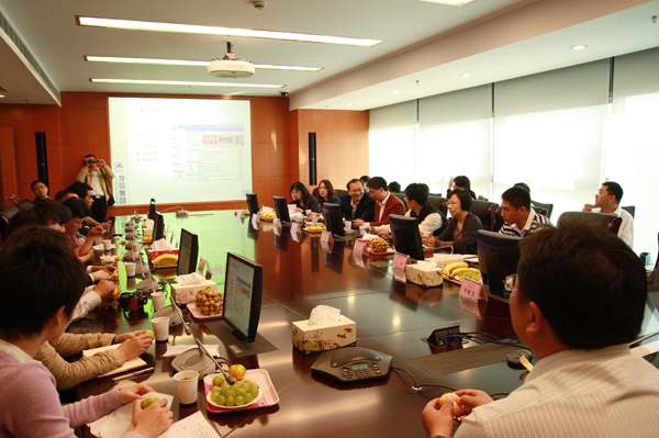 考察團(tuán)參觀了集團(tuán)公司20樓展廳、2樓研發(fā)房和1樓部品件展示中心,在2樓遠(yuǎn)程監(jiān)控中心和視頻會(huì)議室,聽(tīng)取觀看了集團(tuán)公司遠(yuǎn)程監(jiān)控系統(tǒng)、3G單兵操作系統(tǒng)、新中大信息化操作系統(tǒng)、遠(yuǎn)程培訓(xùn)系統(tǒng)的介紹和演示。部分人員還就信息化建設(shè)過(guò)程中存在的問(wèn)題與公司相關(guān)人員進(jìn)行了深入交流和探討。