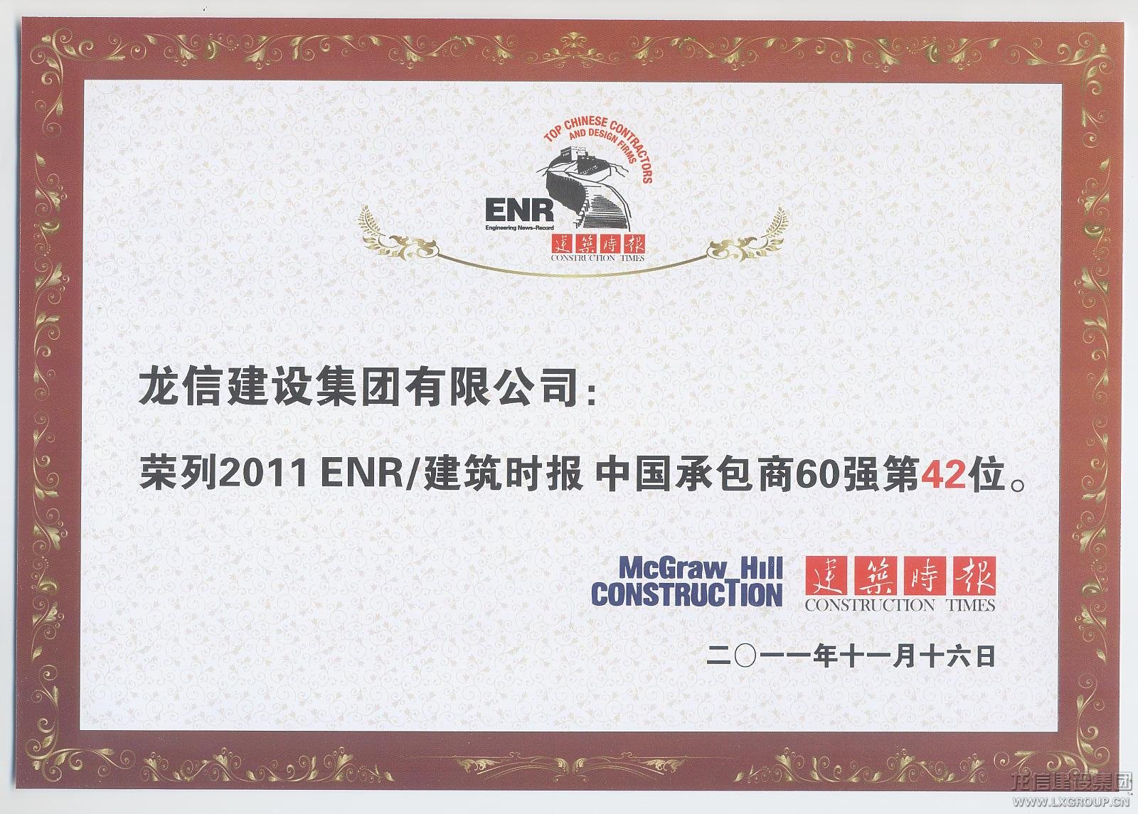 2011年ENR/建筑時(shí)報(bào)“中國承包商和工程設(shè)計(jì)企業(yè)雙60強(qiáng)”在滬揭曉。60家承包商及60家工程設(shè)計(jì)企業(yè)入選2011年中國工程界的“最強(qiáng)陣容”,龍信集團(tuán)連續(xù)三年榮登“ENR中國承包商企業(yè)60強(qiáng)”,并以比去年提升11名的成績榮登最具成長性企業(yè)。